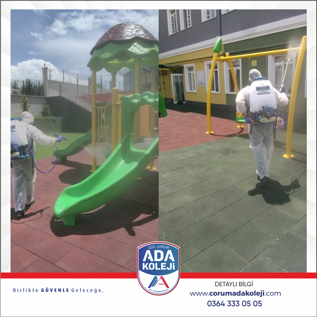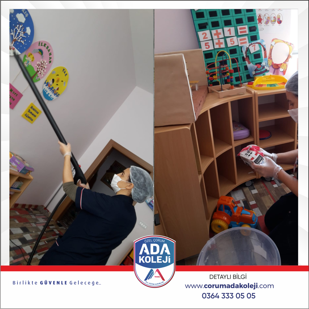 Özel Çorum Ada Koleji Anaokulu olarak covid-19 kapsamında tüm önlemlerimizi aldık. Sevgili çocuklarımızın dokunacağı tüm alanlarımızı ve oyuncaklarımızı buharlı makine ile temizleyip dezenfekte ettik.